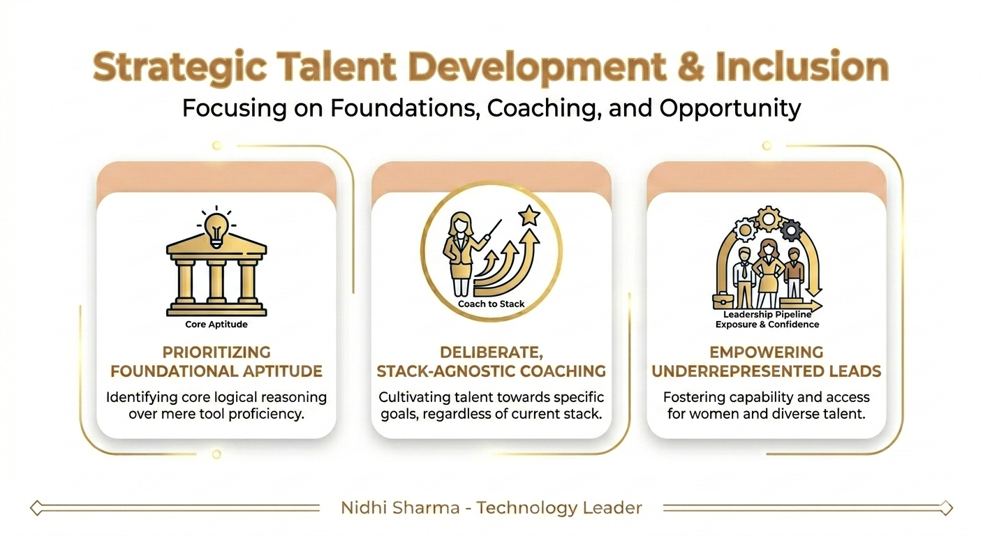 Great teams are not hired — they are built. Over ten years leading globally distributed engineering teams, I have developed 170+ technology professionals through a simple but powerful philosophy: hire for aptitude, coach for everything else.